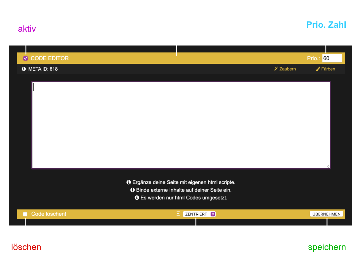 ... und so funktioniert's!Aktiviere den Master Stern in der Login-Bar. Wähle Stern Plus am Ende der Seite. Nun kannst du wie im Bild ganz oben eine passende Meta Vorlage auswählen. Folgender Aufbau und Funktionen gelten für alle Meta Vorlagen.Wenn Du die Meta aktiv Check-Box deaktivierst, wird der Inhalt für Besucher unsichtbar. Mit der Prio. Zahl wird definiert, an welcher Stelle auf der Seite der Meta angezeigt werden soll. Aktivierst du die Meta löschen Check-Box wird der Inhalt gelöscht sobald Du Übernehmen drückst.